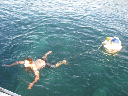 Supplies tied to Nick's ankle (12 San Miguels please!) |